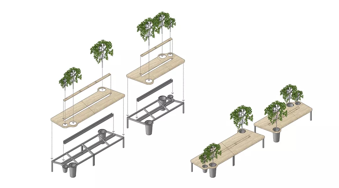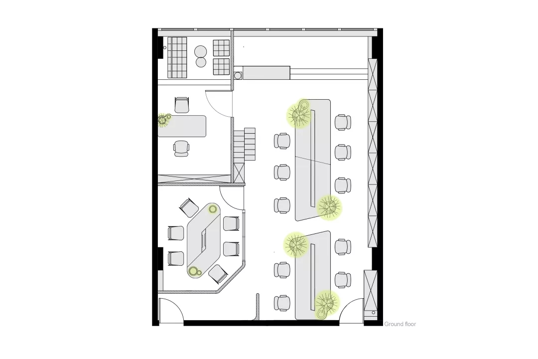 同時我們希望有一個張別具一格的會議桌,但是會議桌極強的功能性使得難以去進行改變。于是,會議室空間本身的形狀缺陷成了這張桌子想法的起點。由于避讓入口玄關(guān),會議室空間有一個角是切掉的,墻壁是斜著放置,如果是長方形的會議桌,就必然在這個斜墻前造成使用空間不夠缺陷,無法坐人.所以就產(chǎn)生了一個平行四邊形的會議桌,斜邊與空間的斜墻平行,也讓整個斜墻前的空間可以坐下一個參會者,再嵌入一些小草,一張獨特又實用的會議桌就出來了。