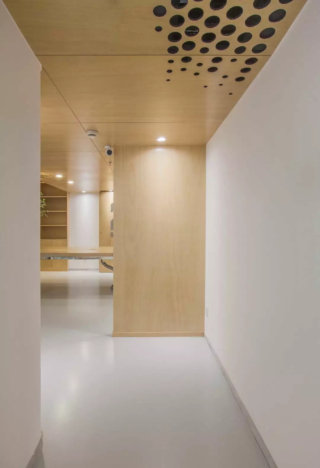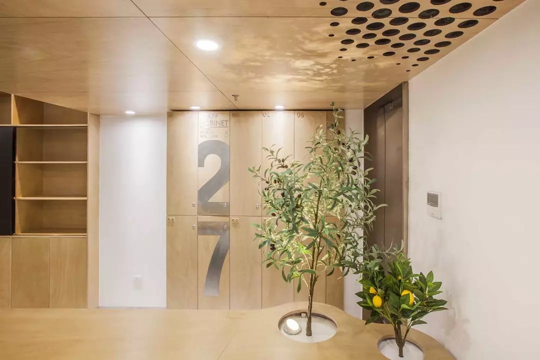 功能融于樂趣與創(chuàng)意,兩個空調(diào)的回風(fēng)孔也不能放過,市面上的百葉口為了實用而完全無法融入環(huán)境。由于吊頂也屬于木質(zhì)體塊,所以經(jīng)過試驗,一個充滿漸變的點陣圖形,解決了這個問題,不同規(guī)格的開孔器進過精心布置并開洞,讓空間回歸純粹與樂趣。