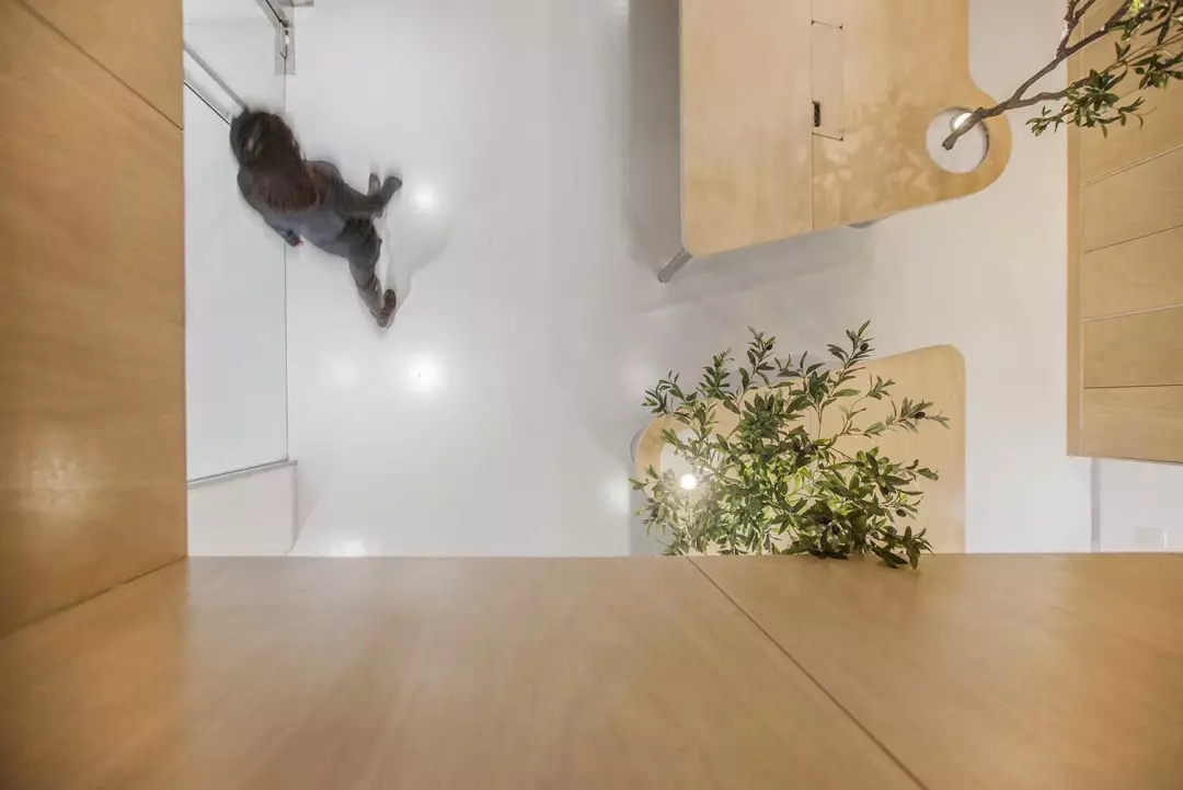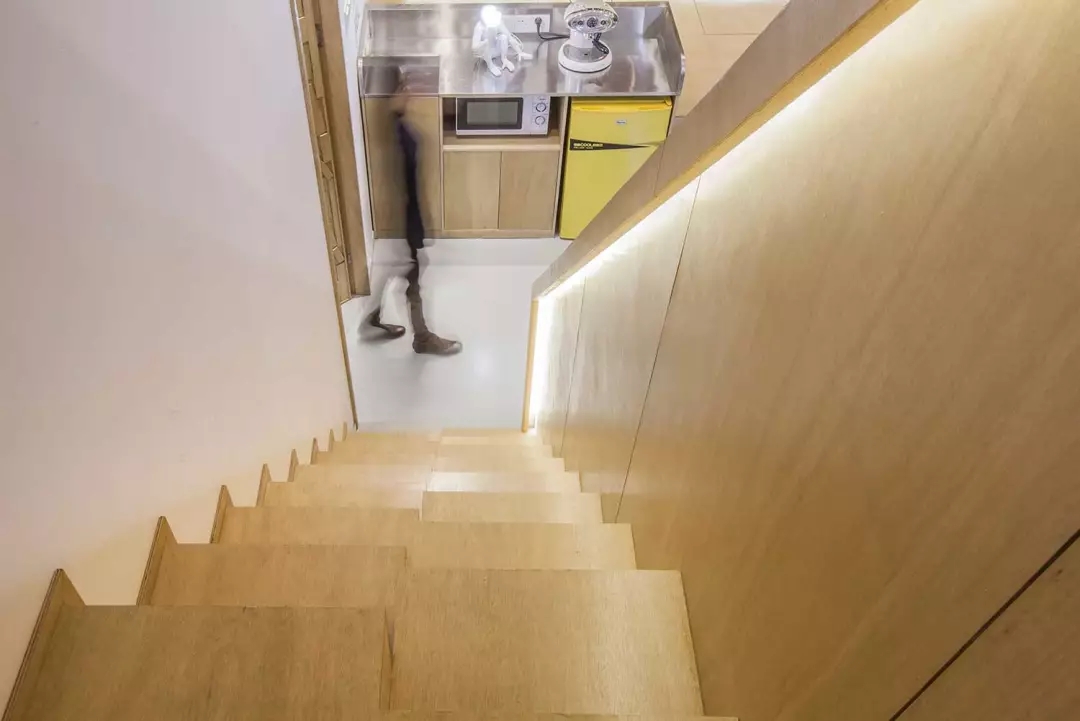 ▲交錯的樓梯節(jié)省了樓梯的長度,避開了頭頂?shù)臋M梁,順帶凹個造型