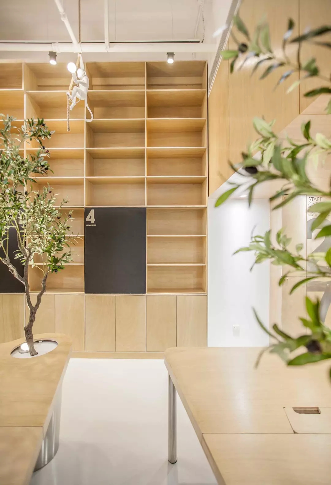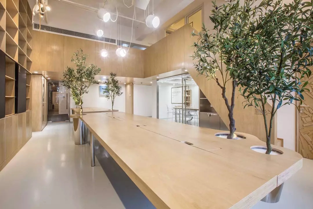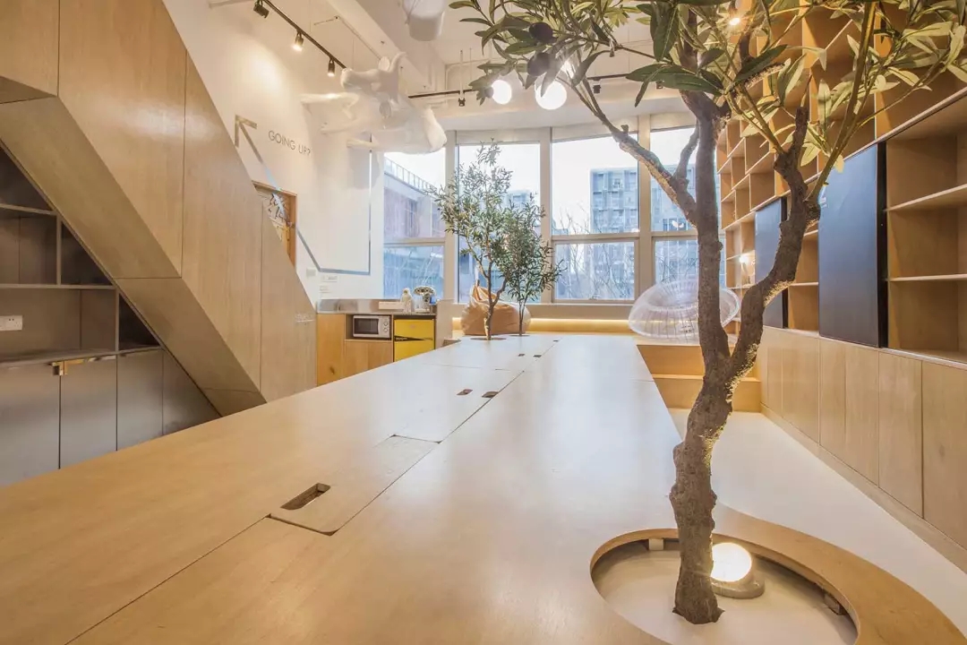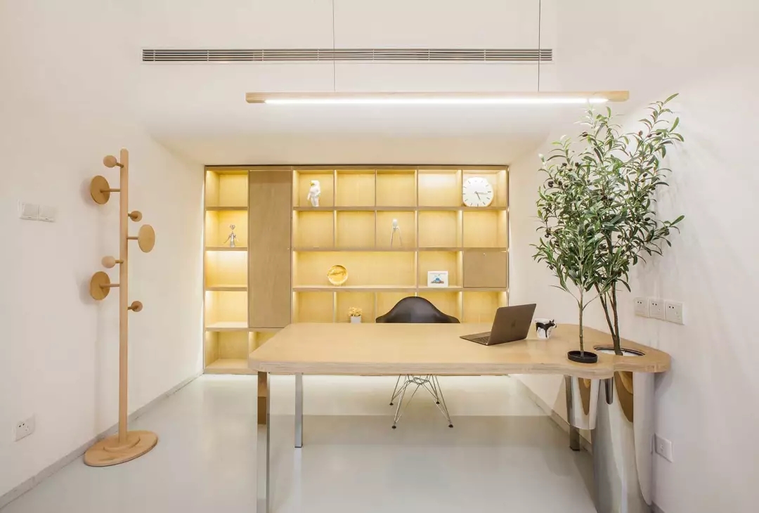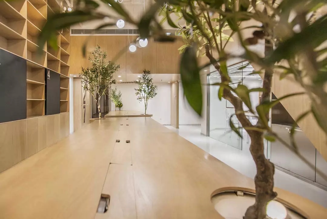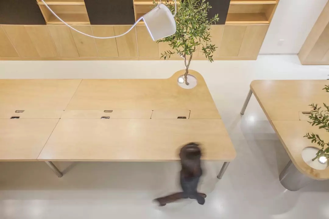 辦公桌與樹的結(jié)合,成為了整個空間的內(nèi)景觀,也與外面的綠色形成呼應(yīng),消減以往辦公的緊張氛圍。整墻的書架也不甘無趣,在實用的框架下,產(chǎn)生一絲波動的起伏,如同山崖,如同坡面。