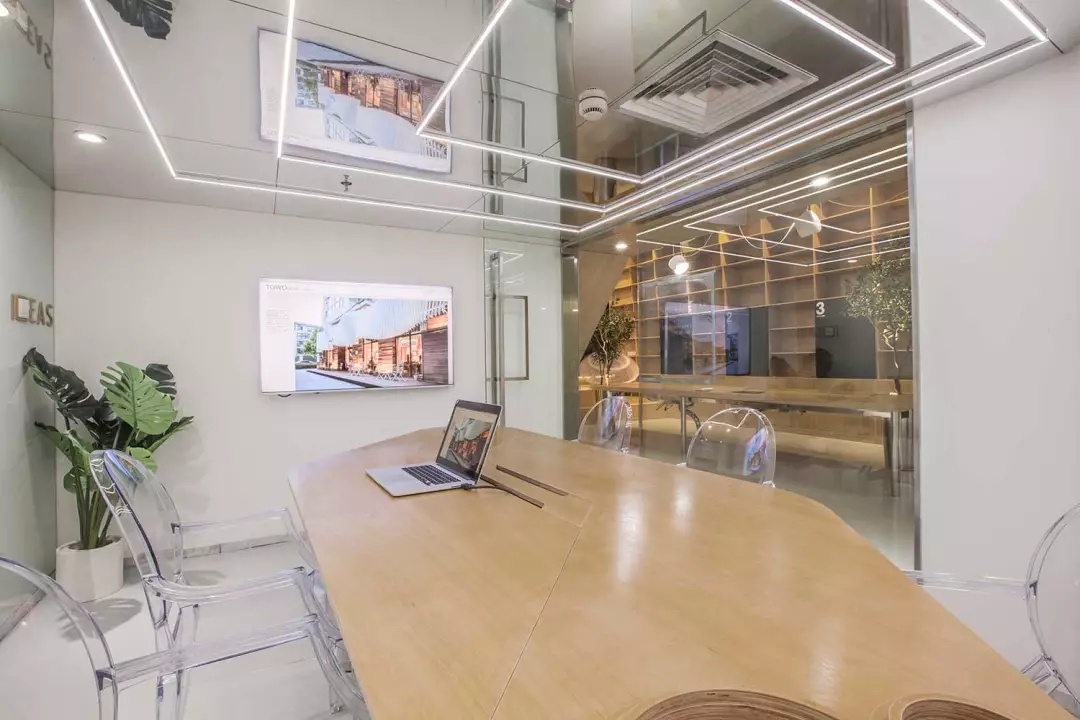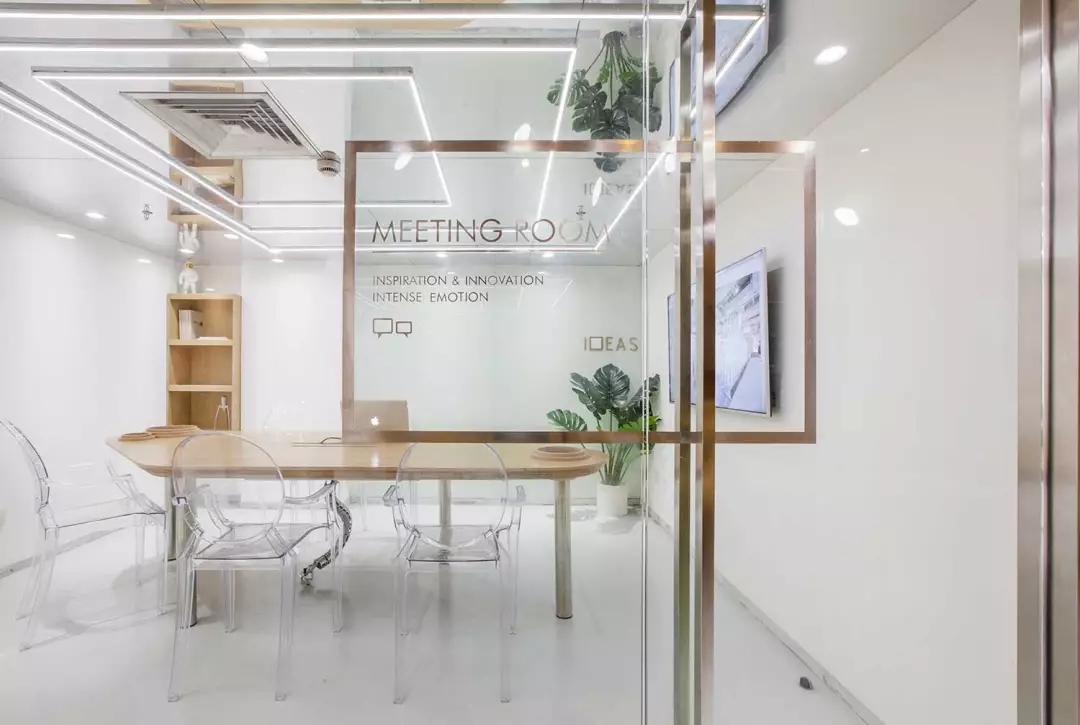由于層高的限制,會議室感覺比較壓抑,所以將整個天花變?yōu)殓R面,化解的層高的局限,也讓空間感別具一格.但是空調(diào)的出風(fēng)散流器非常扎眼,空調(diào)的位置決定了風(fēng)口位置無法移動。而市面上又找不來合適的可以符號化的替代品,于是,就順勢而為,將會議室的照明以散流器為中心進行布置,讓散流器的方框與燈光呼應(yīng)起來,形成了會議室有意思的圖形。