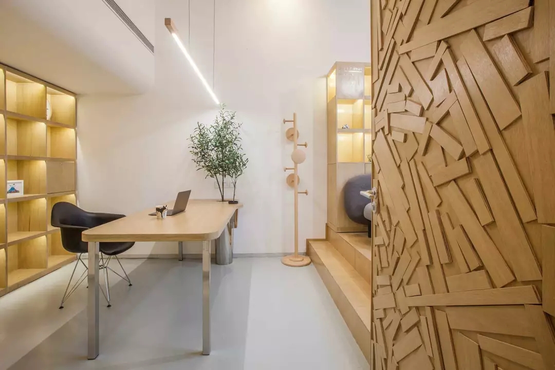 該項目位于上海市閔行區(qū)七寶萬科國際;我們希望工作室足夠的輕松、溫性、創(chuàng)意,于是通過顯性與隱性的符號對我們的目標進行構(gòu)建;空間用了大量溫暖的木色,并組成木質(zhì)的空間體塊,這些體塊以整個白色空間為背景,進行功能與空間節(jié)奏上的構(gòu)筑: