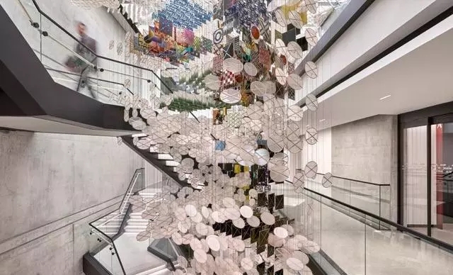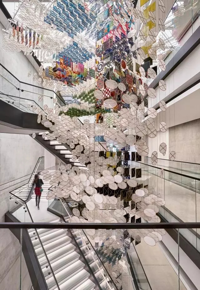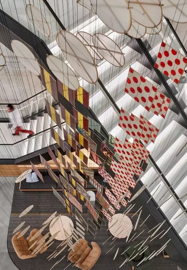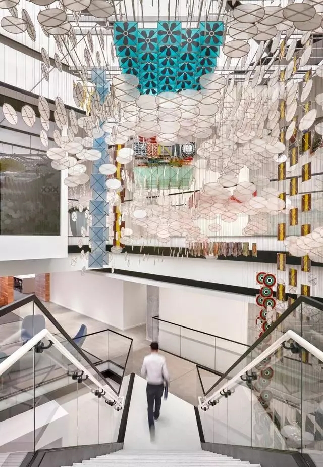 麥當(dāng)勞總部芝加哥一個充滿活力的長廊布局像博物館或畫廊空間每個總部的九個故事都被設(shè)想為一個逐層展開的“篇章”。建筑物中央中庭的多向樓梯提供了醒目的焦點(diǎn)和休閑互動的大道,同時(shí)也創(chuàng)造了一種在許多方向向前移動的ESCHER-ESQUE感覺。在這里,JACOBHASHIMOTO的巨型藝術(shù)作品向下瀑布,包括數(shù)百個他的標(biāo)志性微型“風(fēng)箏”。