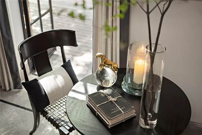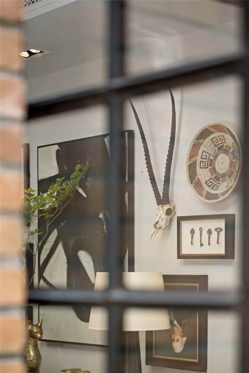 起居室背景展示墻,以混搭風(fēng)格鋪陳出洛普普的敘事展現(xiàn)。原始的羚羊頭飾,彷若征服野性蠻荒,象征勝利光輝。鑰匙是正在延續(xù)著的權(quán)勢(shì)標(biāo)志。設(shè)計(jì)師用跳色的編織盤與抽象藝術(shù)畫將微量的彩色疊加進(jìn)黑白灰的間隙中,呈現(xiàn)出別樣、細(xì)膩的風(fēng)情。而左下角的守護(hù)貓,一如埃及傳說中神秘的幸運(yùn)守護(hù)者,正看顧著明亮通透的窗外,不斷朝曦夕映的美好時(shí)光。