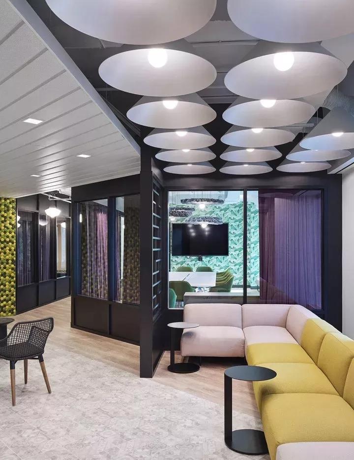 一間正式會(huì)議室,墻面鋪滿了綠色棕櫚葉墻紙,并配以綠色扶手軟椅,在綠色清新風(fēng)中,具有吸音性能的紫色布藝窗簾形成鮮明的色彩對(duì)比。毛氈聲學(xué)燈具BuzziPleat更是為整個(gè)空間錦上添花,帶來美美的視覺。