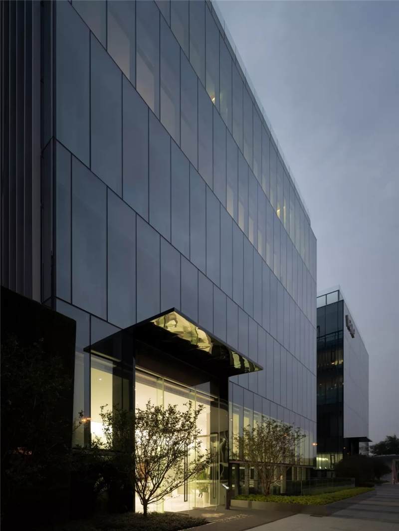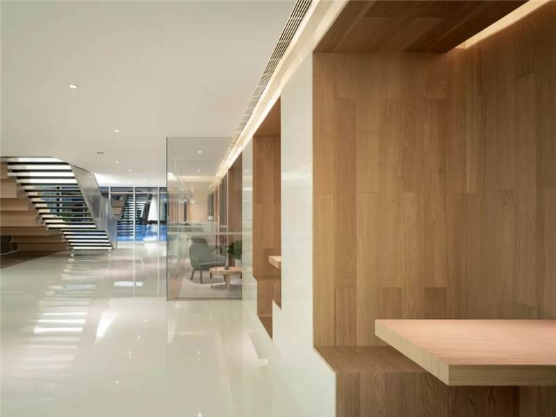 In terms of materials processing, wood andterrazzo with natural texture are selected. The white plastered walls and brownwooden floors and window frames on the fourth and fifth floors are perfectlymatched with the greenery of the atrium, creating a comfortable and cozy officeatmosphere. The basement floor and the first floor are mainly spaces forcommunication and display and have a strong public nature. Therefore, a largenumber of anodized aluminum plate is used on the wall surfaces. The blurred andpolished anodized aluminum materials on the surface can create a sense of thefuture similar to mirror finished stainless steel, however, it is not so coldas that, but a little humane warm feeling. In addition, the makeup of the woodprovides the space with a warm and comfortable feeling.
