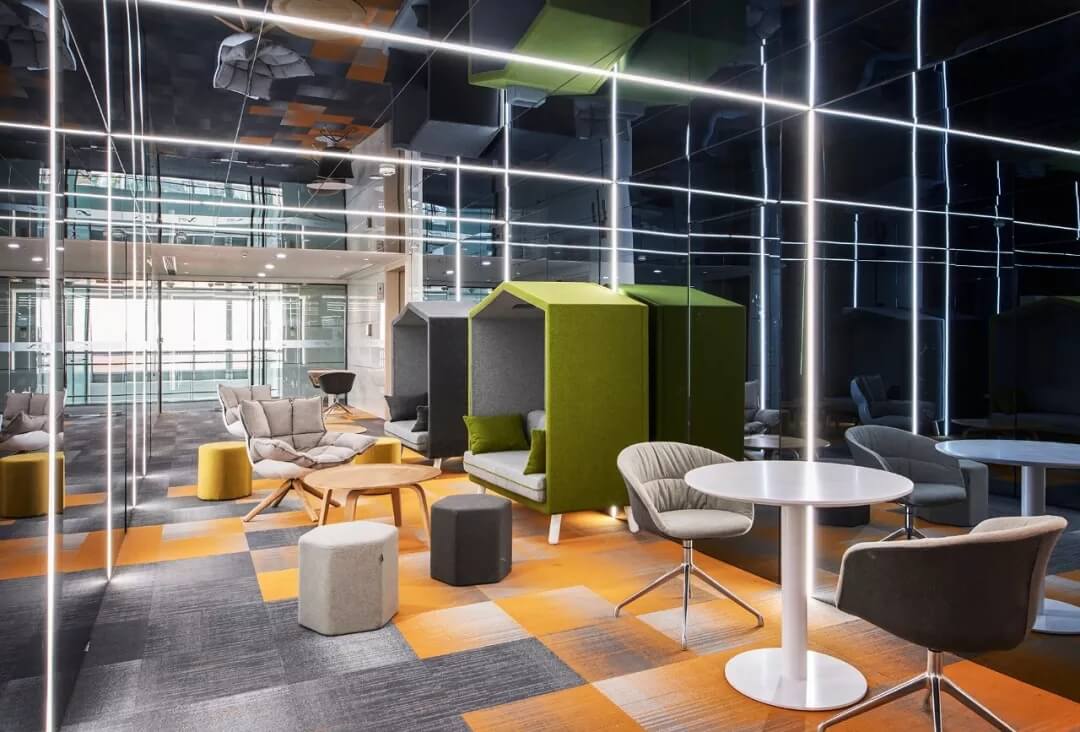 在軟裝設(shè)計(jì)上,該區(qū)域家具軟裝及墻壁,選擇明快的色調(diào),展示青春活力,并且用黑色烤漆玻璃內(nèi)嵌燈帶的方式營(yíng)造氛圍,透著數(shù)字化和科技感,表現(xiàn)商湯在數(shù)字時(shí)代的不同場(chǎng)景中,所呈現(xiàn)的多元化和創(chuàng)新性。