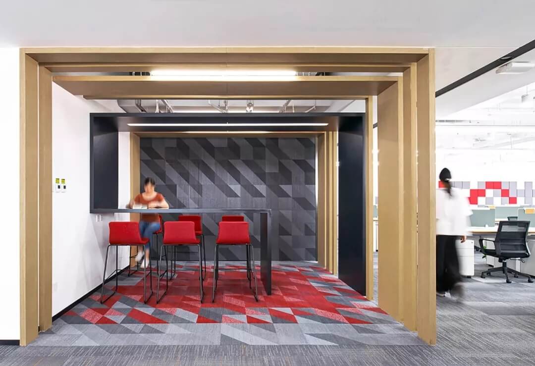 核心筒是整個(gè)辦公空間的混合功能區(qū),頻繁產(chǎn)生互動(dòng)式交流,頭腦風(fēng)暴,也是重要的會(huì)客及自由移動(dòng)式辦公區(qū)。在設(shè)計(jì)上,艾迪爾設(shè)置了滿(mǎn)足不同會(huì)客需求的休閑討論區(qū),連接著標(biāo)準(zhǔn)辦公區(qū)和公共通道,營(yíng)造多層次交流氛圍,體現(xiàn)商湯科技開(kāi)放包容的文化價(jià)值觀。