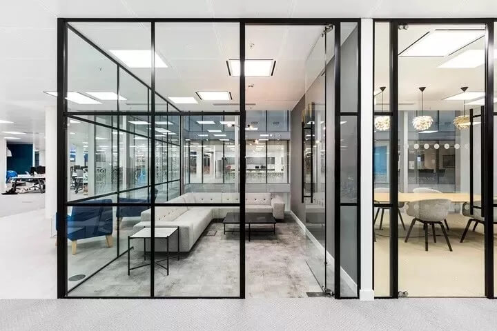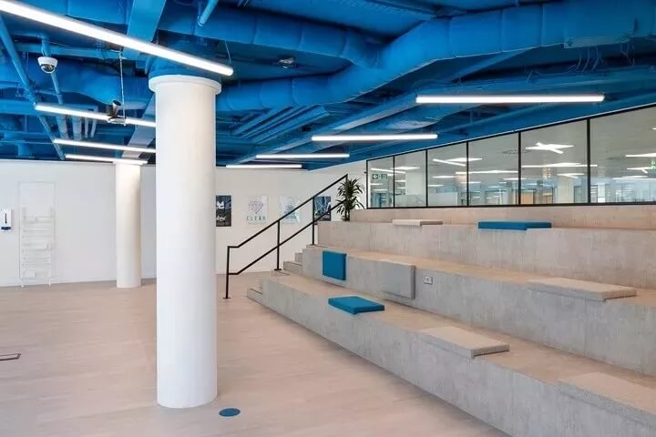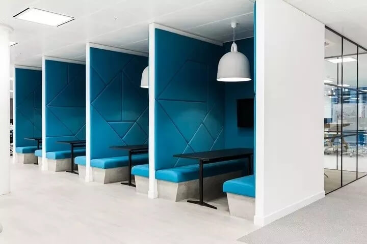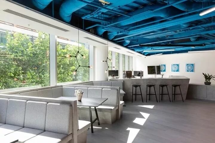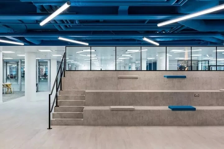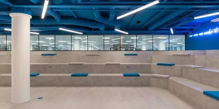 特點:科技,總部、英國、斯堪的納維亞設(shè)計風、寧靜自然簡約、灰色、藍色頂面、水泥質(zhì)感、看臺式階梯座、車廂座、玻璃隔斷