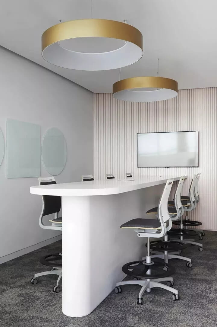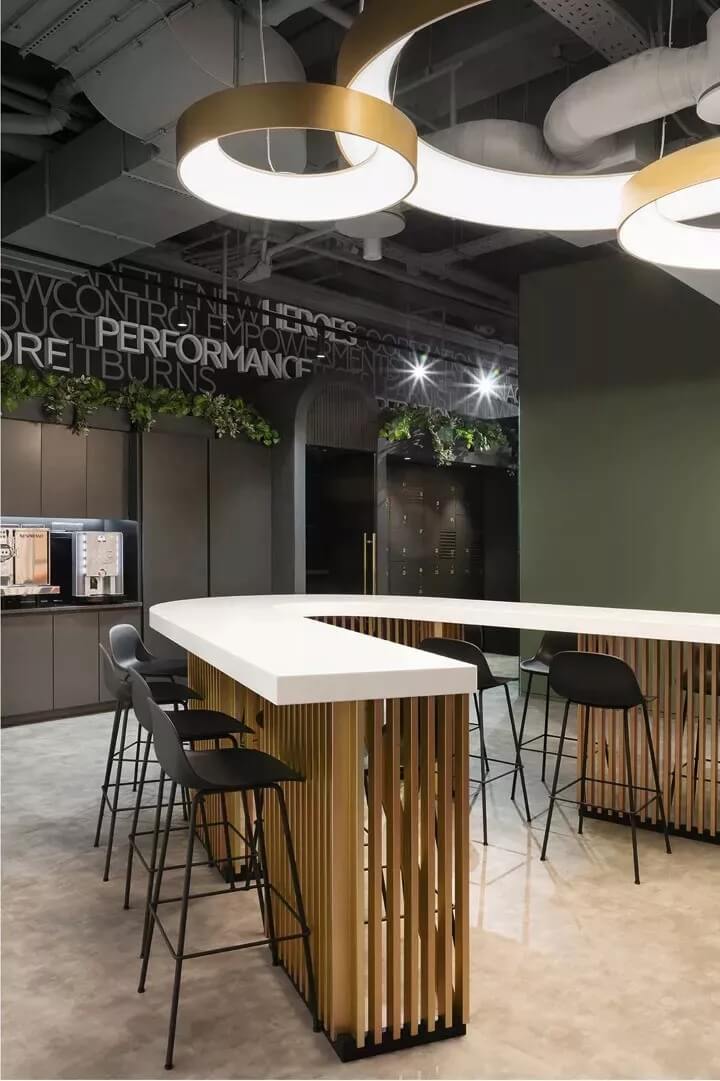 計概念的靈感來源于公司的名稱——L'or(法語,意為gold金色)和aurele(法語,意為halo光環(huán))。“金色光環(huán)”的品牌寓意成為整個空間形式的構(gòu)造背景,整個辦公室的主動線也圍繞著一個圓環(huán)來規(guī)劃。這個中心圓環(huán)被定義為一個明亮的核心空間,形成一個中心會議大廳,周邊分布著或開放或封閉的會議區(qū)。