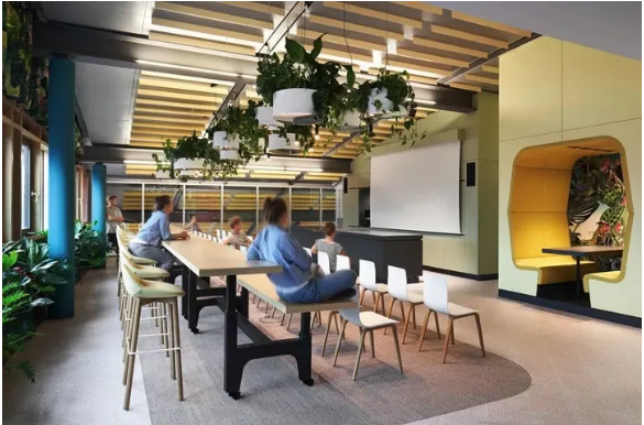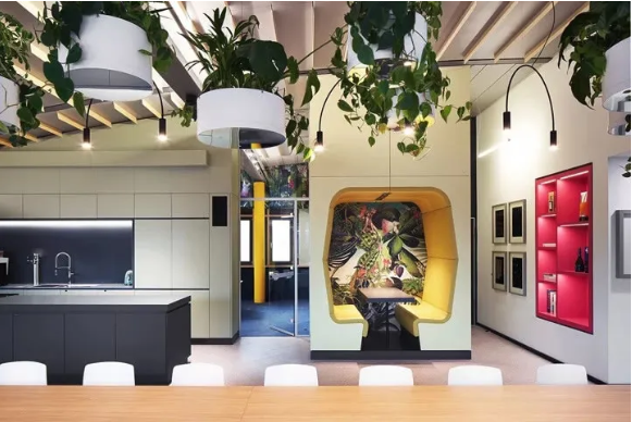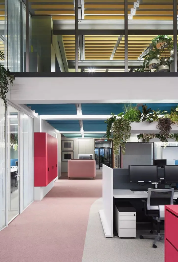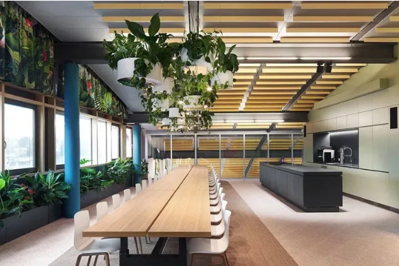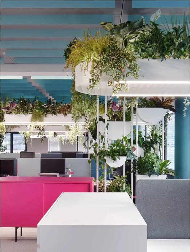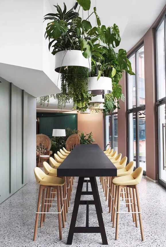 首先,設計團隊為這處工作場所增添了2100個超級盆栽植物。綠植能產(chǎn)生良好的情緒、降低精神壓力、促進創(chuàng)新、提高績效。此外,綠植還能改善空氣質(zhì)量、營造健康環(huán)境,并起到降噪的作用。它們只需定期澆水就能保持茂盛狀態(tài),因此深得人心。室內(nèi)盆栽植物具有強大的正能量。自從加入了這些綠化,室內(nèi)濕度不僅從18%增加到44%,讓人們的體感非常舒適,連員工的病假都減少了一半!