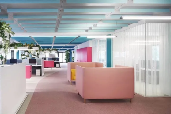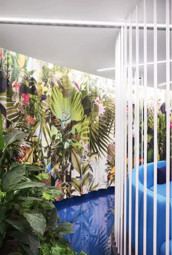 在這個項目中,一個令人著迷的挑戰(zhàn)是在不干擾現(xiàn)有結構的情況下徹底改造建筑物。設計團隊通過改變天花景觀來塑造一個完全不同的場景氛圍。在原有天花板的下面增加彩色條板裝飾。漸變的彩色條板取代了原來的灰色金屬天花板,不僅創(chuàng)建了空間的進深感、也讓身心感覺舒適。藍色,是一種讓人寧靜的色彩,同時能夠促進創(chuàng)造力。藍色向白色的漸變,增添了空間的開放感和輕盈感。