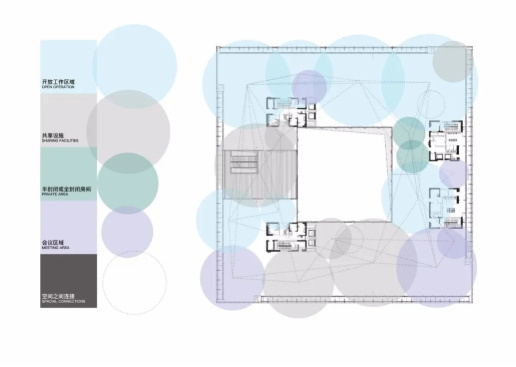 該項目的另一個重要的設計出發(fā)點是設計師期望將上海這個城市的活力與多樣性引入并轉(zhuǎn)化為工作空間的功能分布,因此,整個辦公室中從任意工位出發(fā)走到就近洽談