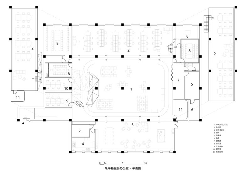 樂平基金會是一家以社會創(chuàng)新著稱的非營利機構(gòu)。在他們1100㎡的辦公空間中,我們提出的基礎(chǔ)理解是適度的身體活動對大腦有益:劇烈運動通常會影響工作,但適量的活動則反而有益。在工作的同時進行一定程度的輕微運動,健康的效果堪比短暫的劇烈運動。因此設(shè)計提供了大量邊工作邊活動的機會,豐富辦公模式,也增加休息的途徑。