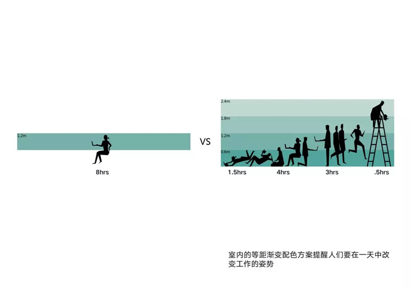 室內(nèi)的顏色旨在提醒人們時刻保持活動,變換工作的姿勢。覆蓋墻身和立柱的藍色以60厘米為間隔漸變,每個顏色對應不同的姿勢和活動,如躺、坐、行走和攀爬。