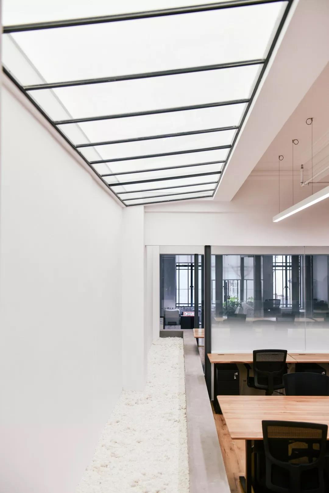 總共三層的空間由于老建筑既有格局的影響,采光較差,我們在有限的面積中挖出一個中庭,同時利用原有的破損樓板創(chuàng)造了若干“天窗”,巧妙地使用照明來創(chuàng)造光亮,消解歷史建筑本身的體量和沉重感。因此,從略顯晦暗、滄桑的歷史建筑走進辦公空間是一種如釋重負的輕快和光明。