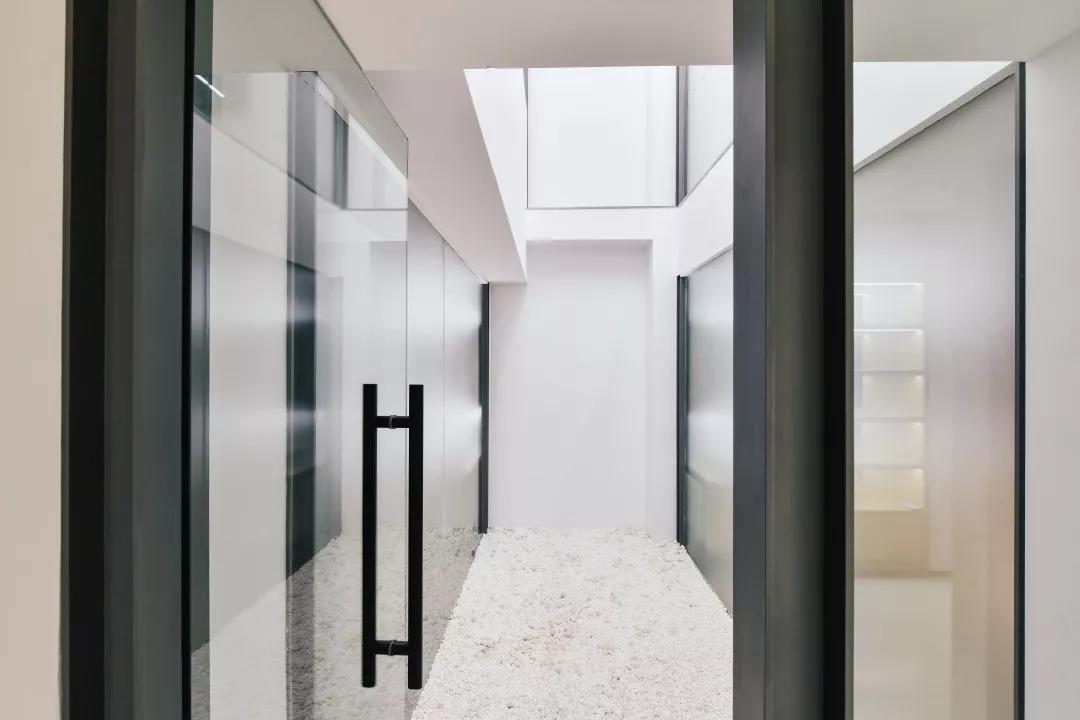 出于功能的需要,我們不得不在空間中加入隔墻,但為了讓老房子的肌理更加清晰,隔墻在與天花線腳的交界處切割為線腳的形狀,令原有天花線腳在視覺上保持連續(xù)。新置入的墻也一再被簡化,只有片段的玻璃、白墻、鋼柱直接裝在舊有構(gòu)筑上。同時,為了盡可能減少干擾視覺的繁瑣因素,我們對細節(jié)反復(fù)推敲,讓每一處純粹到極致。