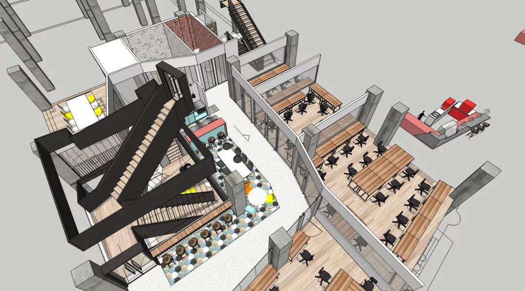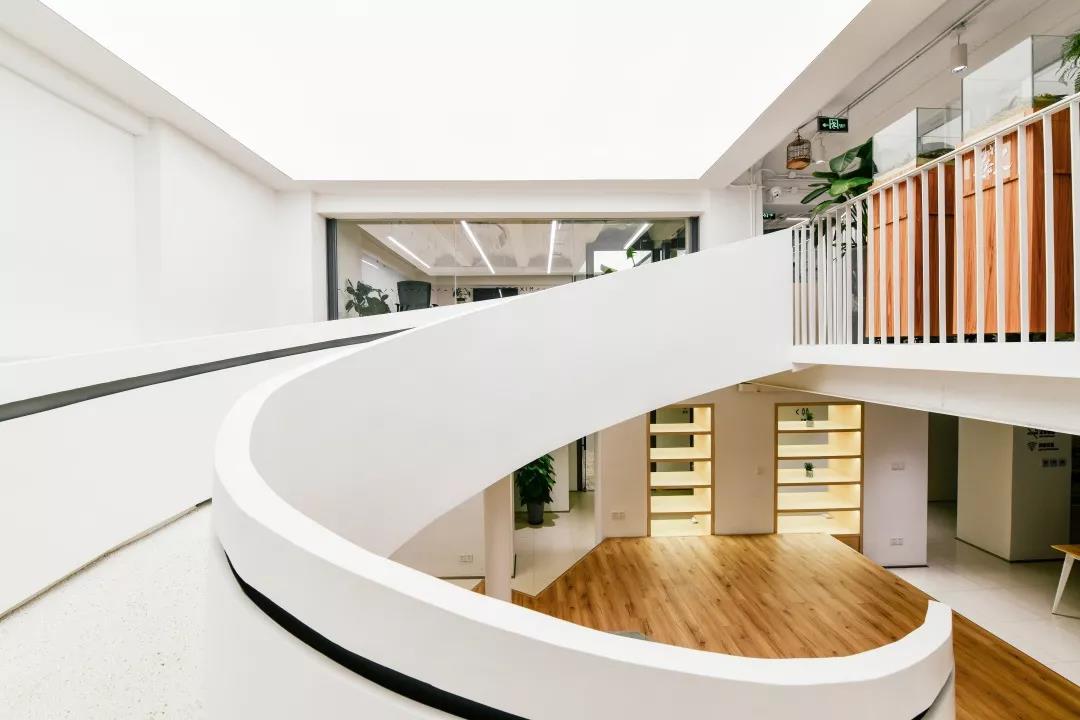 整個空間最大的視覺中心便是中庭里那個“刻意”彰顯存在感的樓梯,優(yōu)美的弧線激發(fā)并引導(dǎo)著大家探索上層空間的欲望。在最初的方案中,它其實并不是曲線,而是剛毅的直線,我們認為直線的迷人在于它的簡單、坦誠,棱角分明且封閉的做法讓它如雕塑一般矗立。