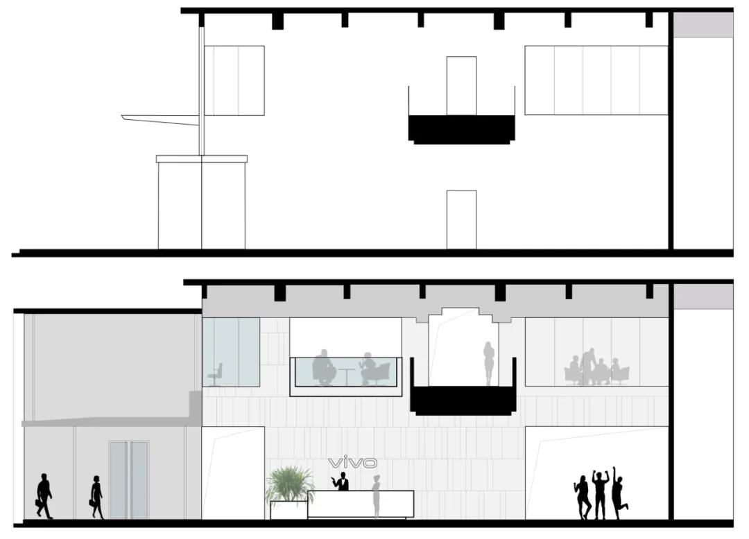 大堂作為整體的對外開放和形象展示空間,配備了咖啡,休閑茶水,展廳,洽談,會議等開放的功能性空間,配以圖像視覺傳達(dá)設(shè)計(jì),軟植入vivo品牌精神。