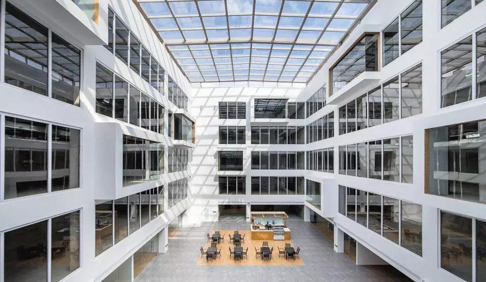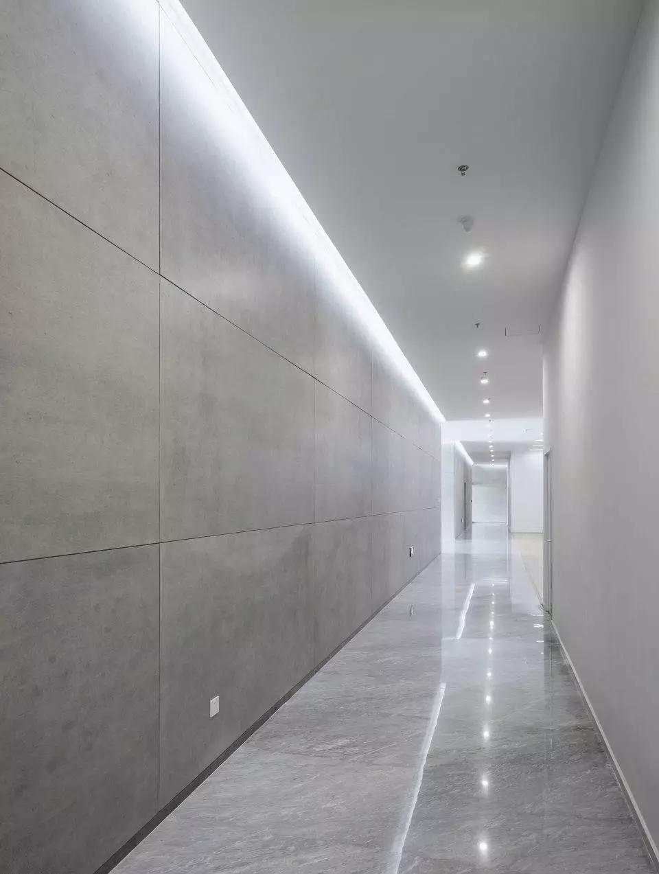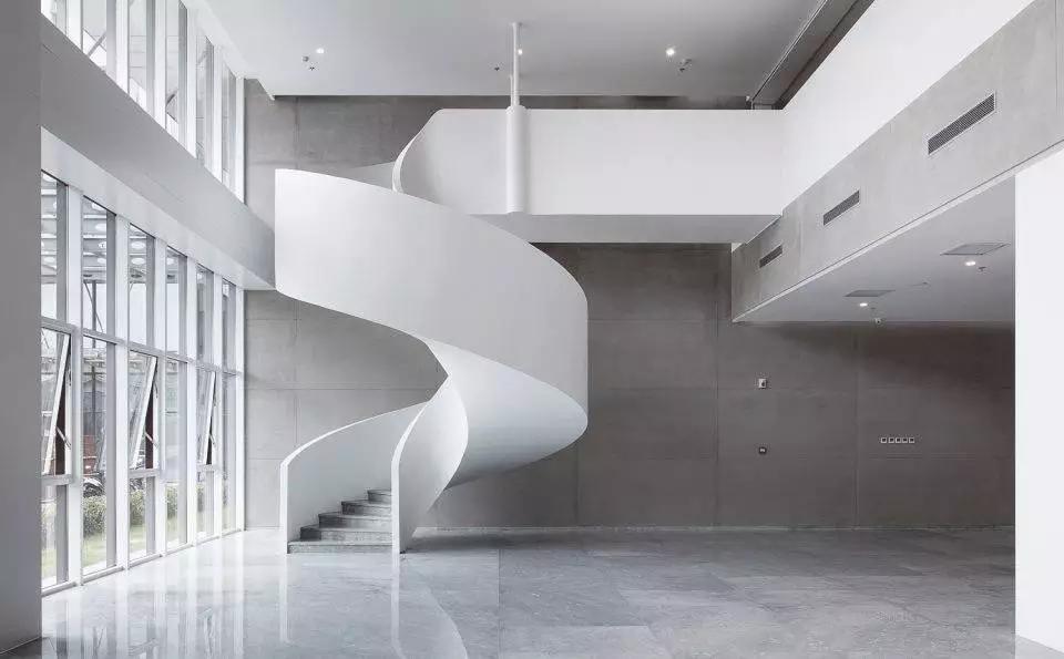 從中庭的自然光到室內(nèi)的人工光,大廈的光影在豁然開朗和細致入微之中不斷變換。中庭必須和天空有所交流,尤其是霧霾肆虐的今天,藍天顯得特別稀有,在中庭上方加蓋玻璃幕墻為上策。流空素影正翩翻,使得存在于強烈靜態(tài)空間體驗中的人又能同時感受到光影與云卷云舒的動態(tài)變化。在典型的辦公樓層,小型私人會議室從中庭立面懸挑而出,并錯落有致,打破了中庭的單調(diào),并增加了最小辦公空間的面積。一側(cè)的螺旋樓梯飄逸靈動,用混凝土演繹出的獨特輕薄感如風裳皎立,引辦公的人們靈感興發(fā)。