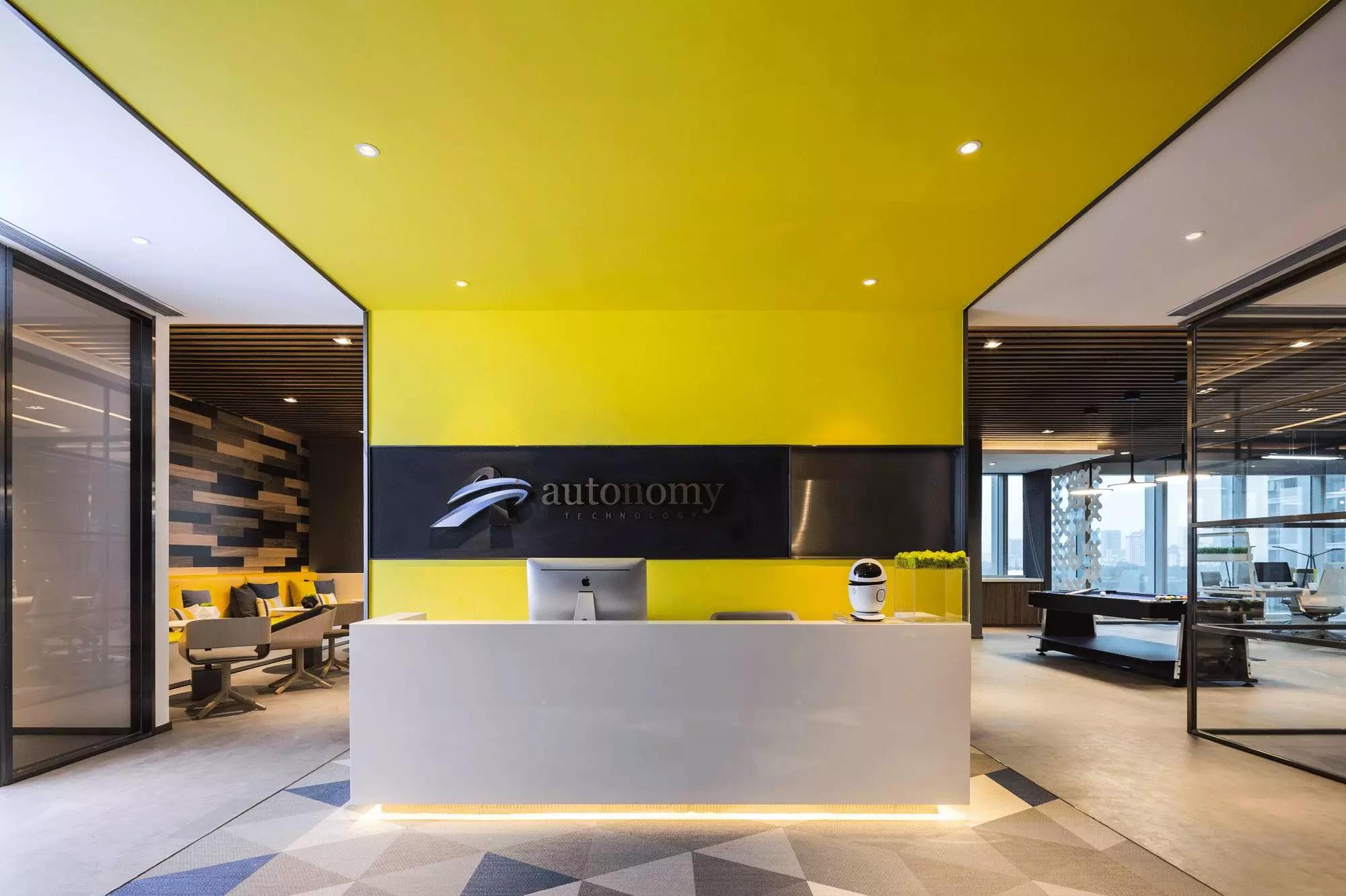 入口,一抹明亮的暖黃尤其奪目,且從背景墻開始延伸、直至天花,渲染了科技感,反差較大的色彩搭配給眼睛帶來強烈的視覺沖擊,一眼便能望見“autonomy”,點明主題。