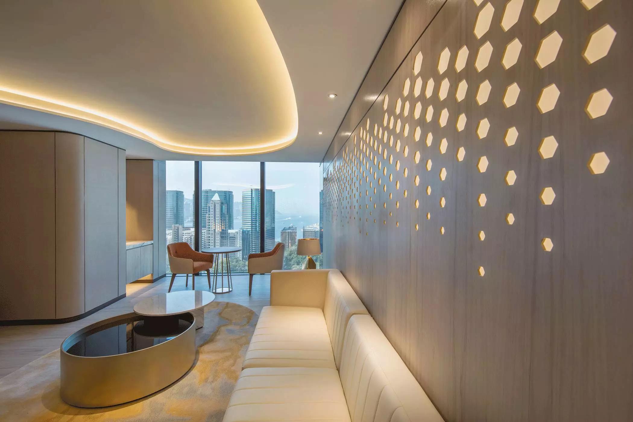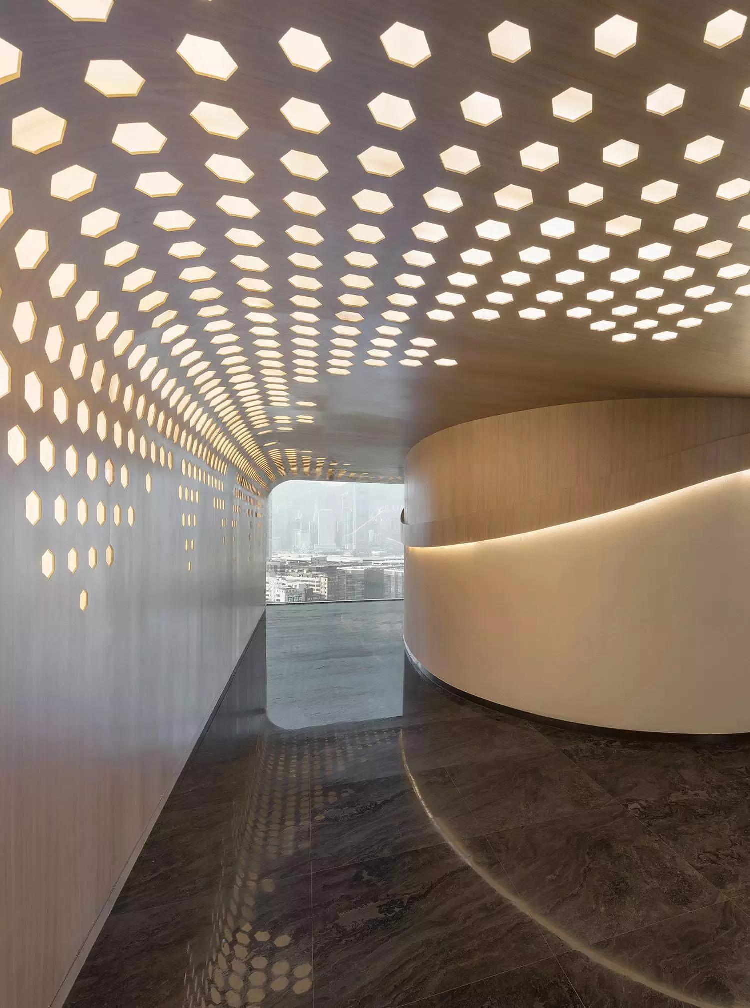 蜂窩形狀滲進(jìn)天花至墻身的燈箱以及屏風(fēng),體現(xiàn)出大自然的親和力讓人心沈靜,宛若森林小徑,葉縫間穿過而灑落的陽光,體現(xiàn)日本韻文中的「Komorebi」靜謐而悠閑涵蘊(yùn)希望。