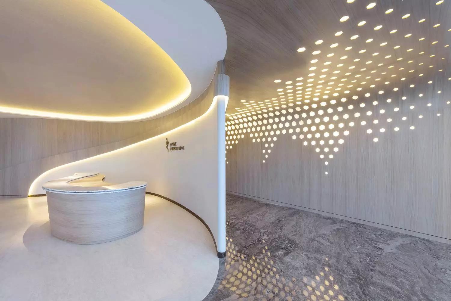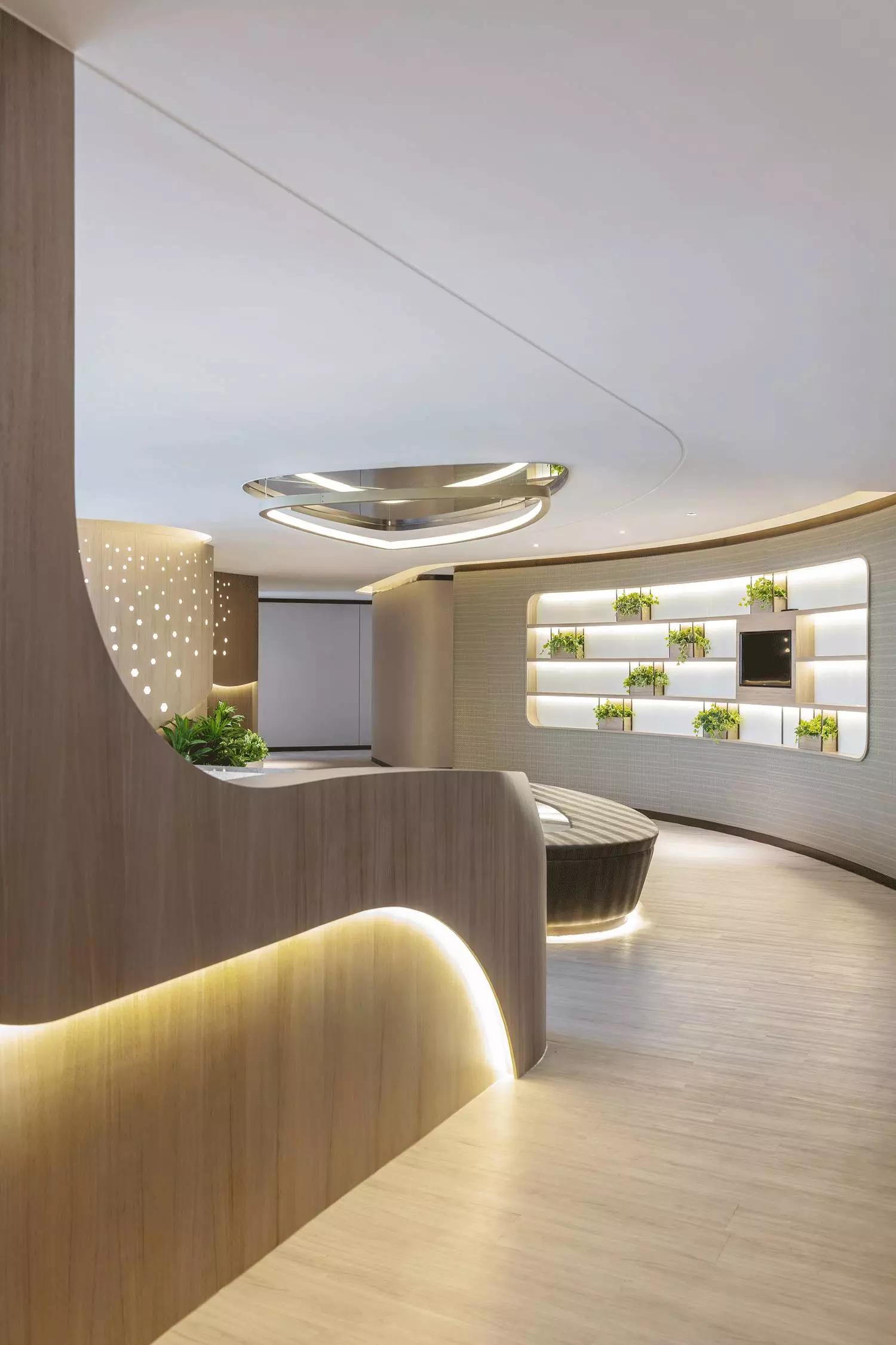 這一切該歸功于大自然的靈感,醫(yī)療中心的正門萃取最純?nèi)坏哪静?,配合溫暖的燈光分布,隨著流線形的空間引導(dǎo)訪客步進(jìn)全開放的接待處。