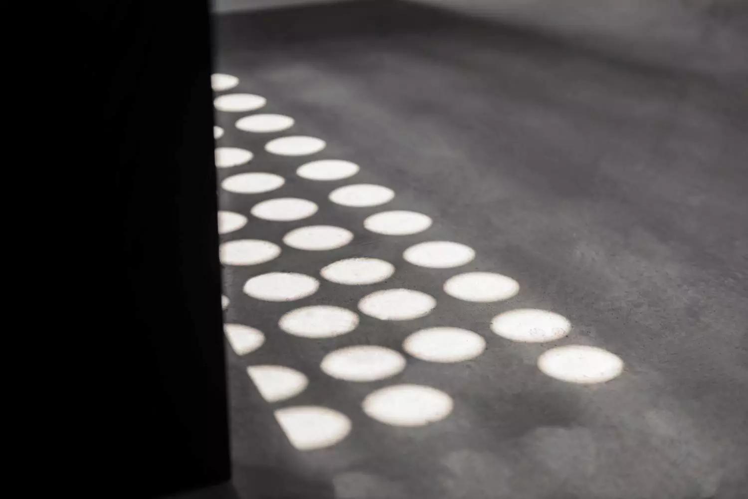 樓頂大小不一的圓孔讓自然光遊蕩在樓梯上,最大限度地借光入室。圓光束如同舞臺的聚光燈,它引導(dǎo)人們聚焦樓梯的肌理細部,也使人隨光前行、探究空間。