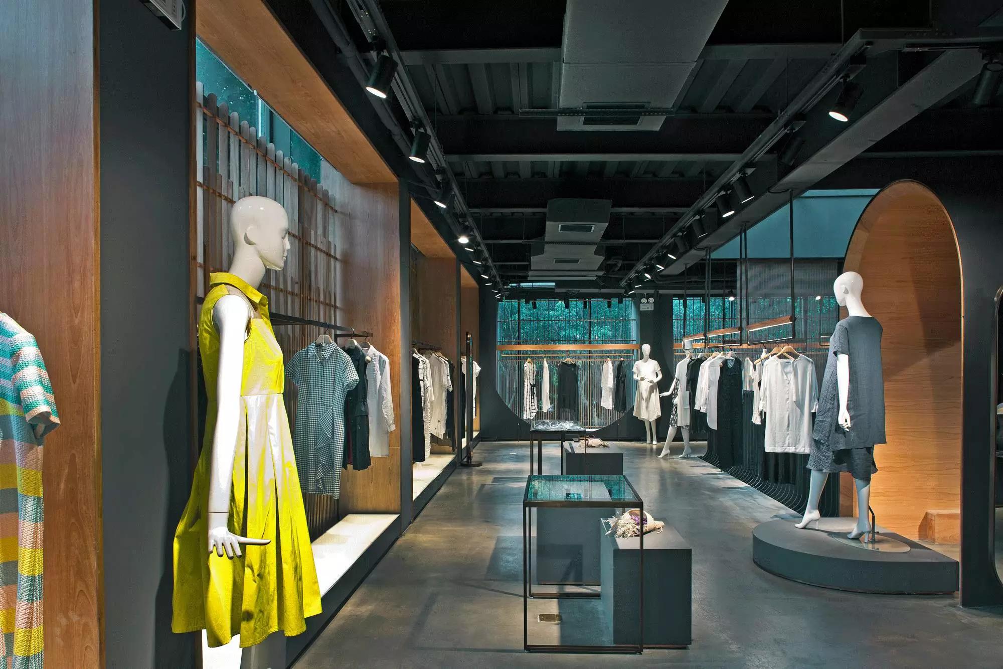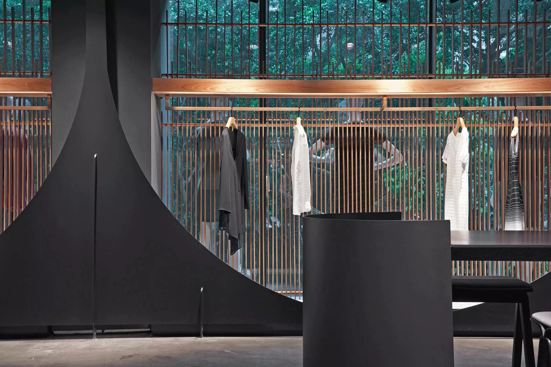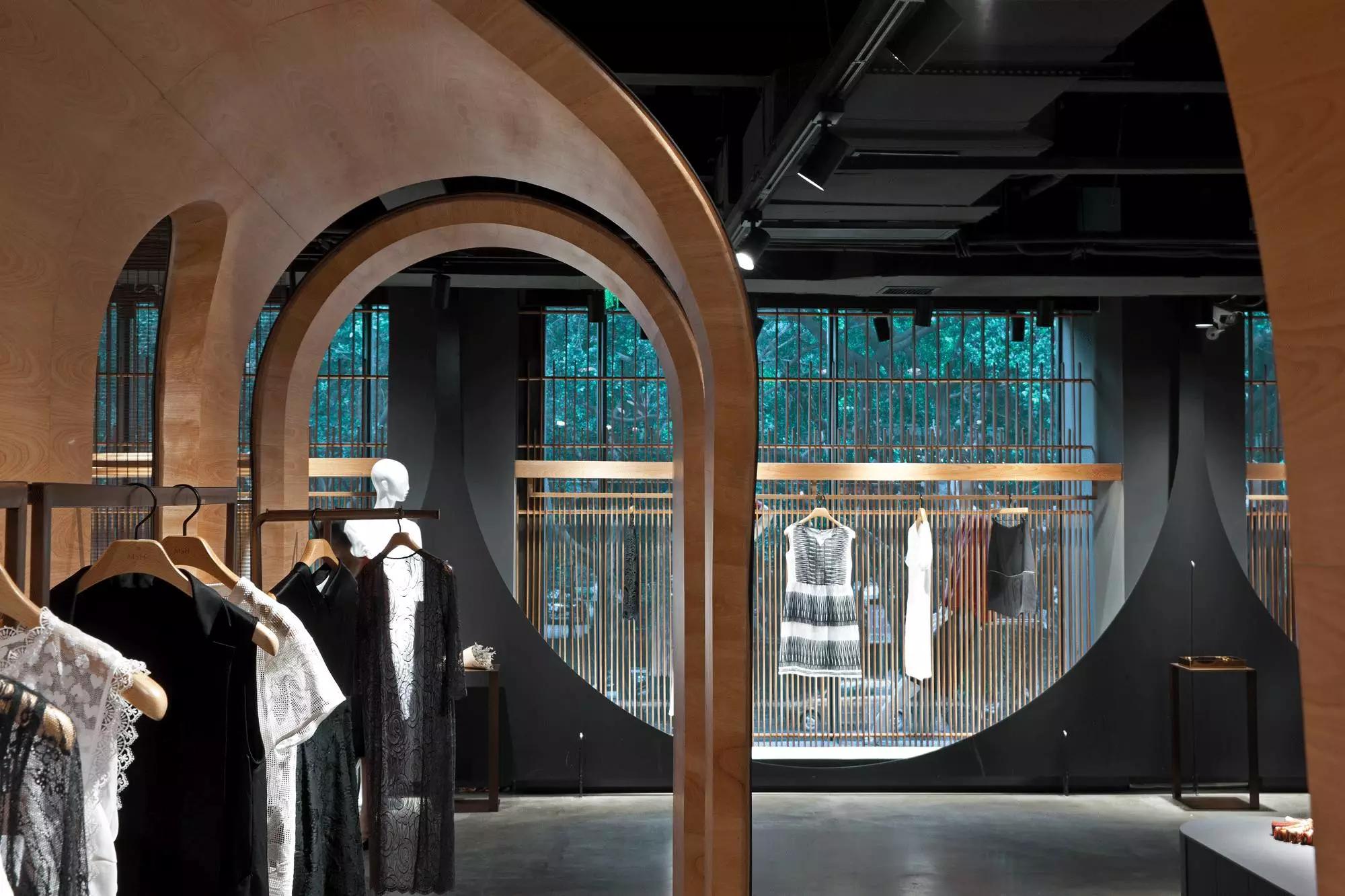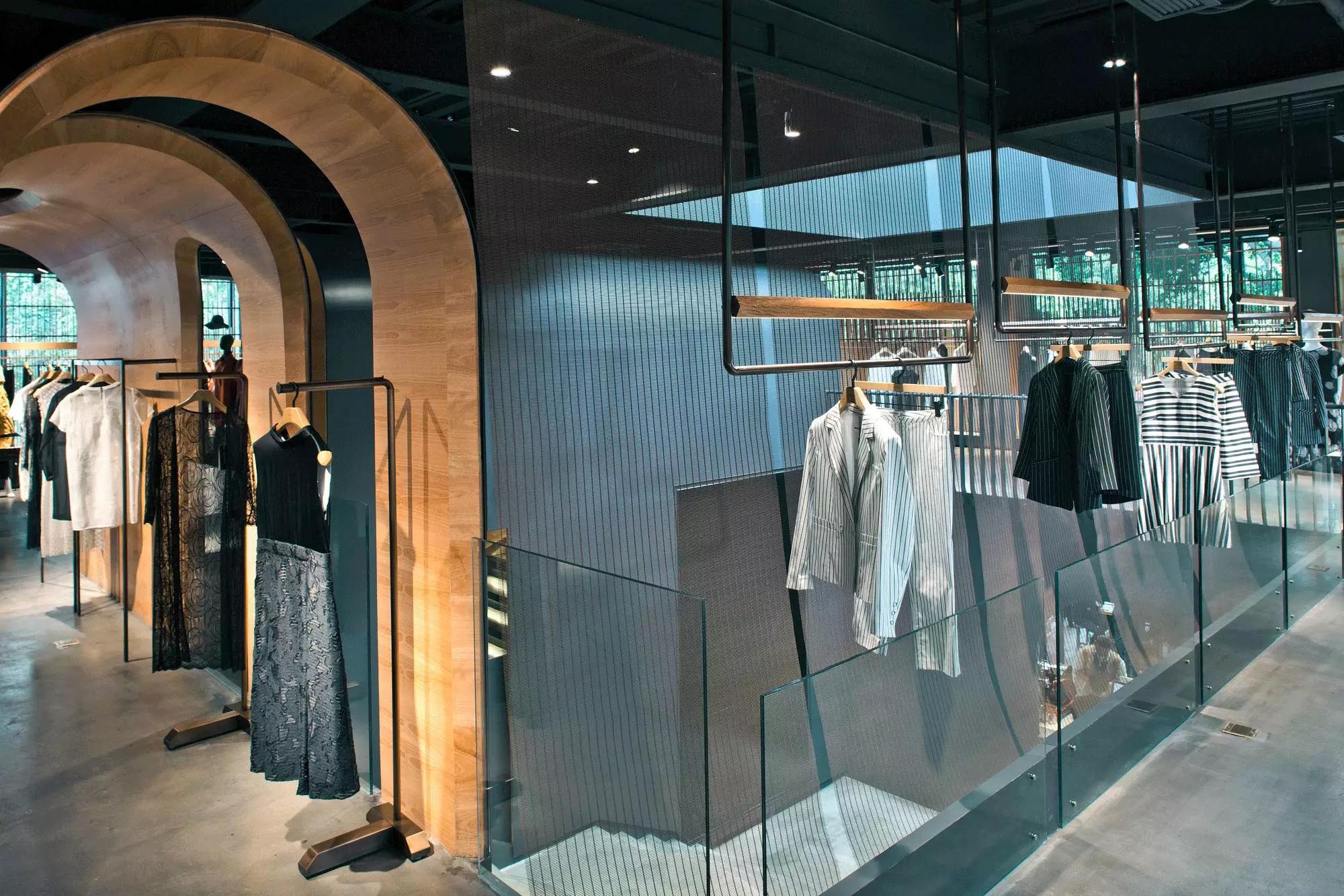 和一般常規(guī)服裝店陳列的概念不同,新的店鋪概念強(qiáng)調(diào)建筑化的零售模式。纖細(xì)的木屏風(fēng)結(jié)合貨架矗立在邊界處,渲染了空間和室內(nèi)飾面的豐富多樣性,建筑元素顯露材質(zhì)原始的質(zhì)感,烘托服裝的品質(zhì),這種手法為整個店鋪灌注純粹的氣氛,隱喻品牌的精神。天井樓梯釋放出不同光影效果,使整個空間與建筑取得一種時間與空間的對話。設(shè)計中,我們直白的將不同的“拱”垂直交疊,希望在垂直空間上制造不同的空間與體驗。這個特殊的表現(xiàn)方式給人們提供強(qiáng)烈的視覺效果。依據(jù)商業(yè)需求,采用模塊式設(shè)計,這樣可以使品牌不同功能具有最大的靈活性。
