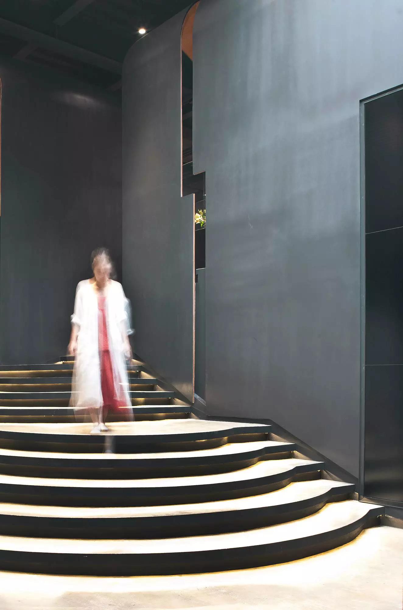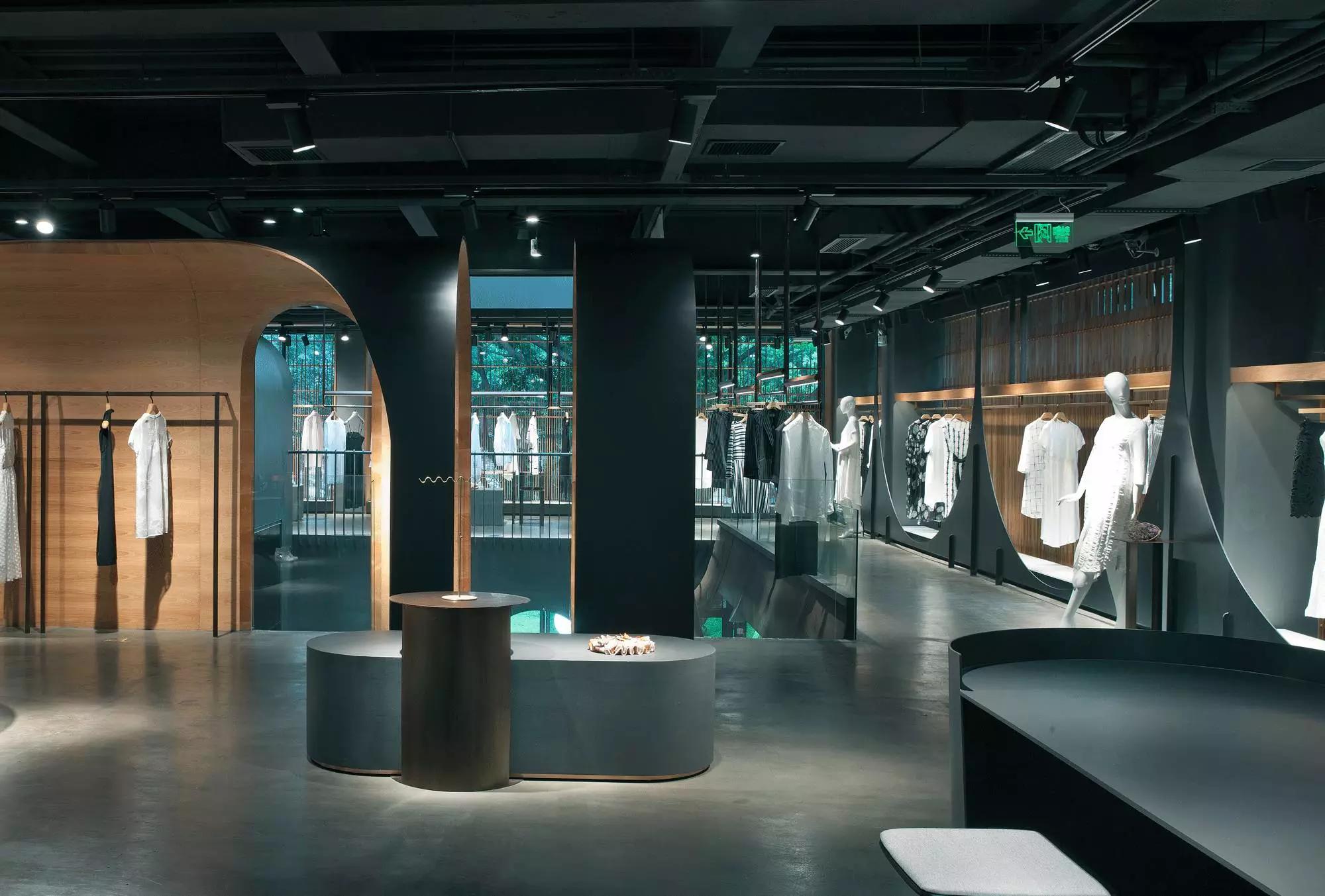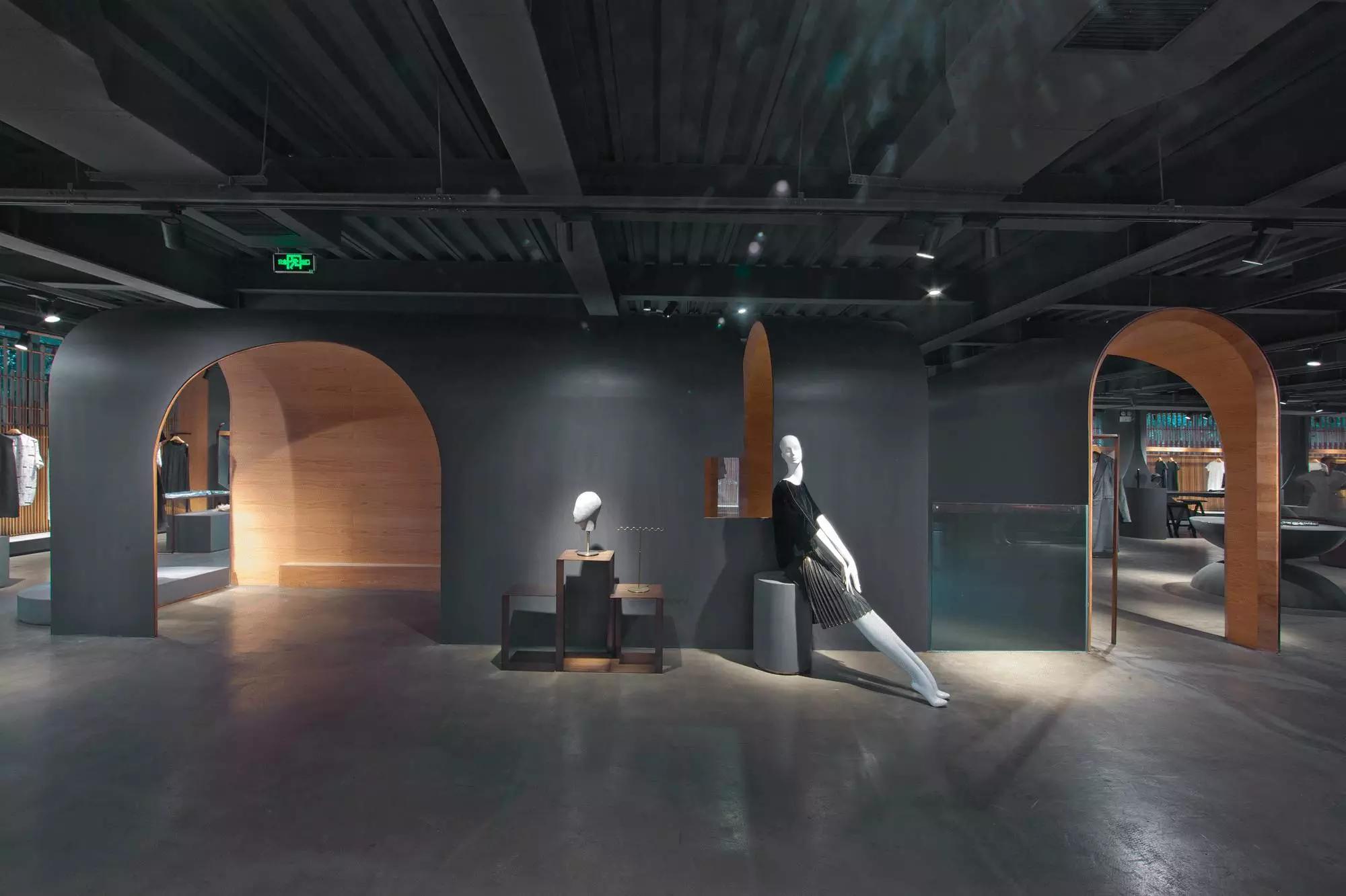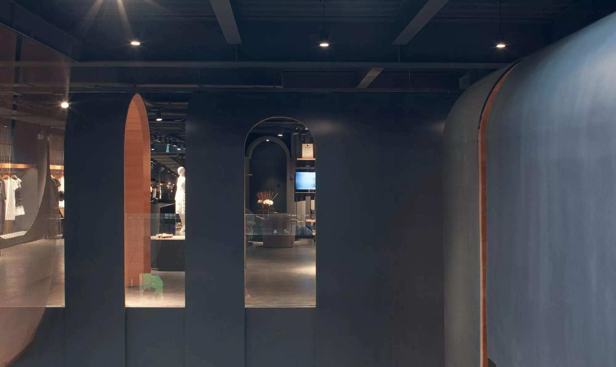 內(nèi)部空間希望呈現(xiàn)一種原始野性的魅力,采用鋼制的表皮帶來一種現(xiàn)實感。這種“直白”式的架構(gòu)材料,空間所形成的直接性與樸素性,加上大尺度的鋼板落地產(chǎn)生的力量感或輕盈感,使整個空間與原有場地建筑取得一種時間與空間的接續(xù)關(guān)系。利用“拱”多變的空間特性,產(chǎn)生不同的空間,打破了均質(zhì)的體驗。這是一個回憶的過程,再一次將建筑的體量與空間對話,越是簡單的形體邏輯,越能給人帶來深刻的印象,弧拱曲線柔和,呈現(xiàn)不同角度的美感?;」暗倪B續(xù)曲線把空間構(gòu)造成圍合區(qū)域,在這樣的方式下,內(nèi)部和外部保持著空間的連續(xù)性,這個理念使空間不拘泥于常規(guī),探索傳統(tǒng)類型空間的新秩序,"拱"在傳統(tǒng)建筑中扮演重要角色,并且在漫長的歷史中不斷豐富。我們試圖轉(zhuǎn)化傳統(tǒng)"拱",讓"拱"在均質(zhì)呆板的現(xiàn)代空間上制造新的突破,獲得自然能量并把它轉(zhuǎn)化為空間秩序。濃烈的空間美感,顯示該品牌的重要意義?;」巴臻g一、二層相連,創(chuàng)建出有趣的空間狀態(tài),吸引顧客的好奇心。