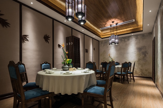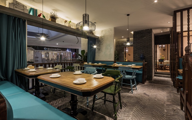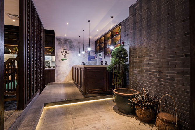 整個店面的平面布局是根據(jù)江南小院建筑布局來延伸切入,以格局的形式將餐廳分成了院入口,陽臺,閨房等五大板塊。江南建筑,高低錯落,古樸幽靜,含蓄內(nèi)斂。